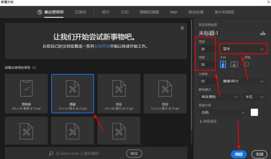 首先需要知道标准1寸的尺寸是25mm×35mm,标准2寸的尺寸是35mm×53mm,接着打开PS创建文档,在选择“毫米”作为单位后,输入标准1寸或标准2寸的宽度和高度,然后点击“创建”。