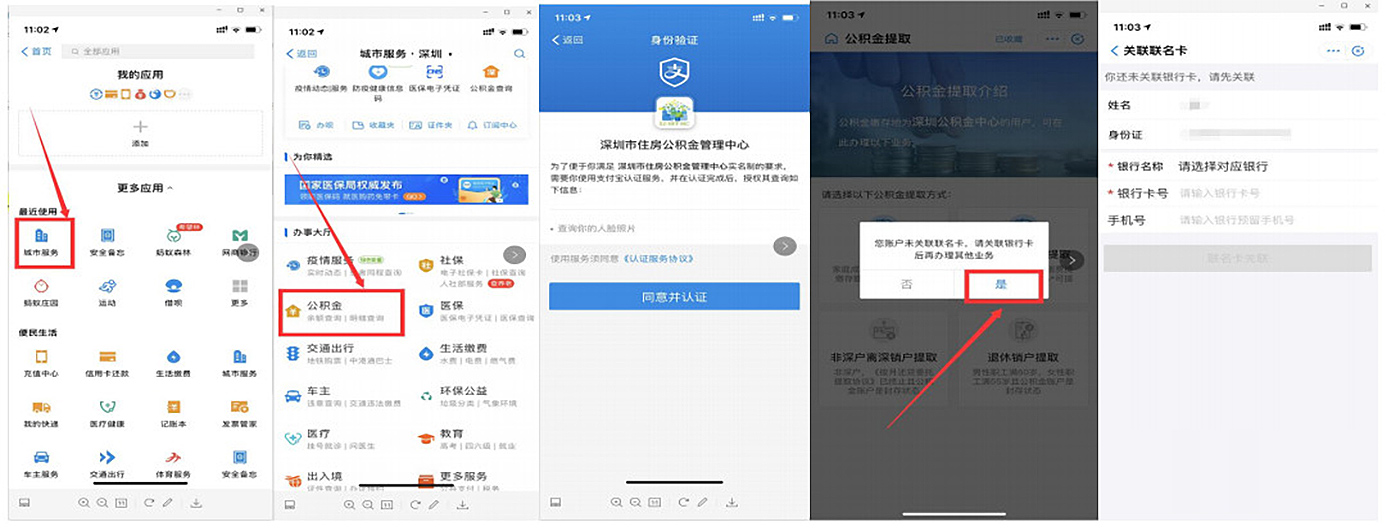 5、养老、医疗保险转入后均选择提交,提交后则流程结束,等待处理,可以登录此网站“查询服务”中进行业务进度查询。6、广州公积金转入深圳:本人持本人身份证,带上本人金融银行卡(需关联),预约后,去任意一家银行办理公积金转移业 务即可(推荐平安银行)。预约流程如下:微信搜索粤省事小程序(城市定位选择深圳)——服务——公积金——登录——预约办理——业务名称(异 地转移接续)——预约时间办理即可。公积金联名卡操作流程:可以在支付宝——城市服务——公积金——公积金查询——公积金联名卡即可办理。具体操作顺序如下: