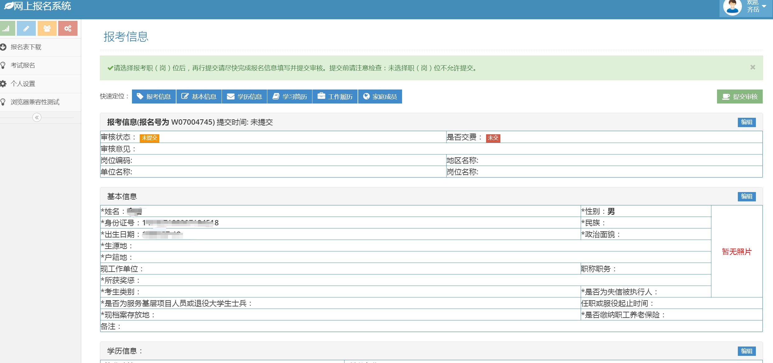 首先编辑个人基本资料,并按要求上传符合要求的数码证件照电子版。