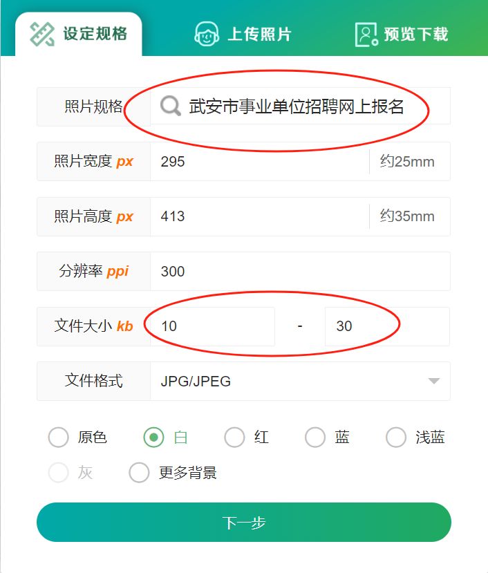 在证件照规格搜索栏中输入并查找:【武安市事业单位】,背景颜色可以自己选择。