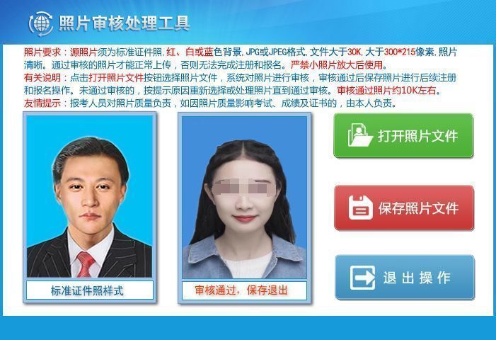 照片文件大小:审核前照片大于30KB,审核后小于10KB。