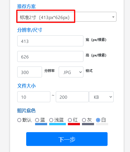 3、在推荐方案中选择【标准2寸】,照片背景选择白色