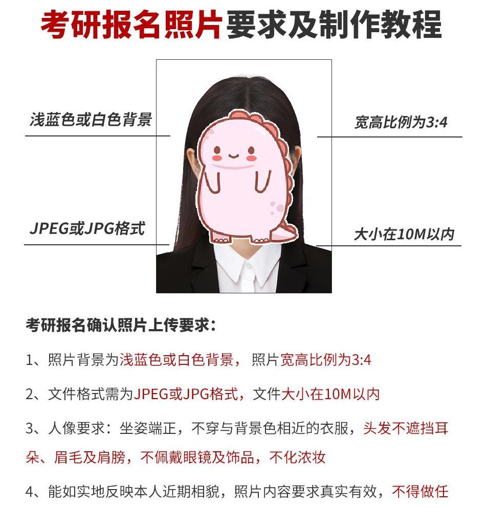 首先,这个照片仅用于考研报名准考证、考场图像单等,并不会作为研究生入学学籍照片和校园卡照片,所以大家不用太纠结,重点是如何符合审核要求,快速通过报名。