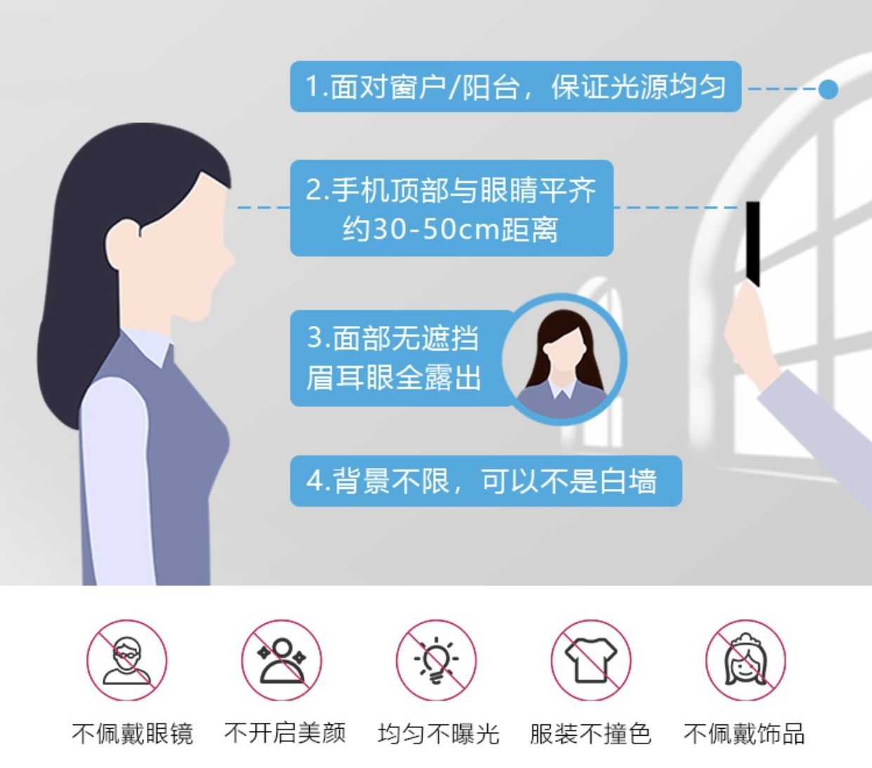 3、人像要求:坐姿端正,不穿与背景色相近的衣服,头发不遮挡耳朵、眉毛及肩膀,不佩戴眼镜及饰品,不化浓妆;