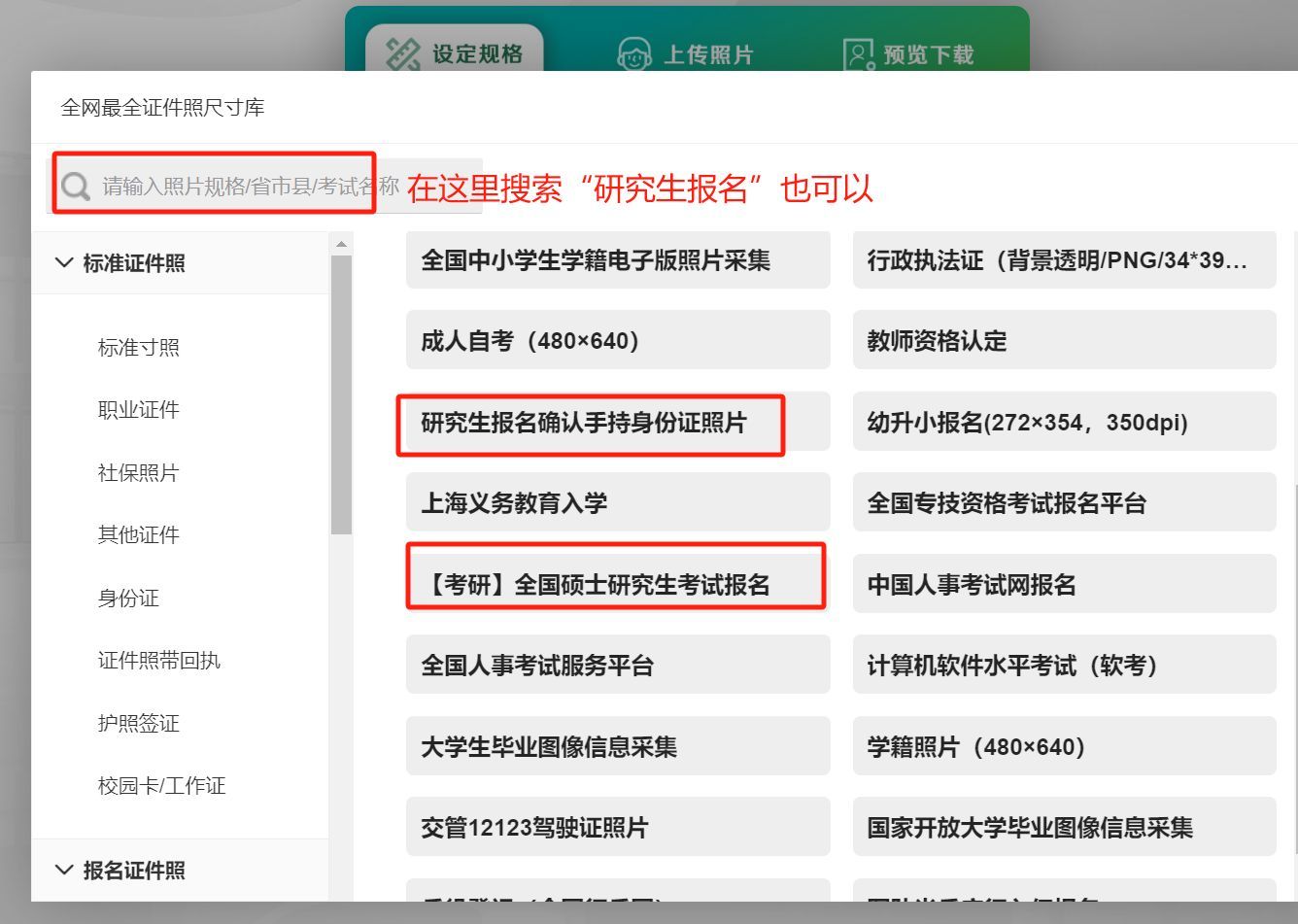 我们先进入”证件照“,在照片规格列表可以直接看到【研究生考试报名】的设置,选择即可: