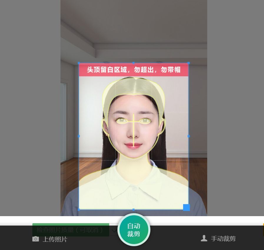 上传照片后,可以选择自动裁剪或者手动裁剪,这样可以避免照片中人物比例过大或者过小,这也是很多同学照片被拒的原因。