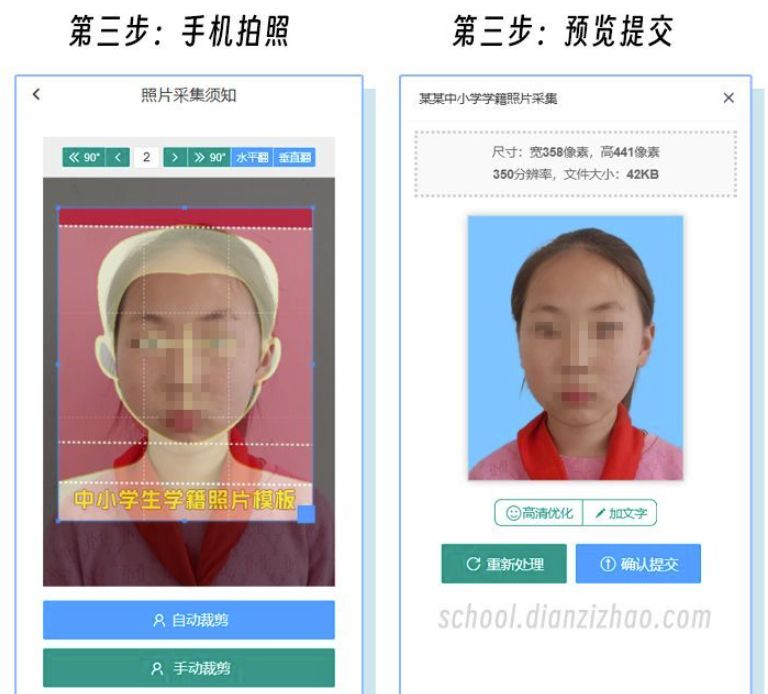 5)现场拍摄:班主任或班干部在教室内用手机相机依次为学生拍照,无需幕布和补光灯,系统后台自动完成背景替换、尺寸裁剪和 质量优化,可实时预览最终效果。