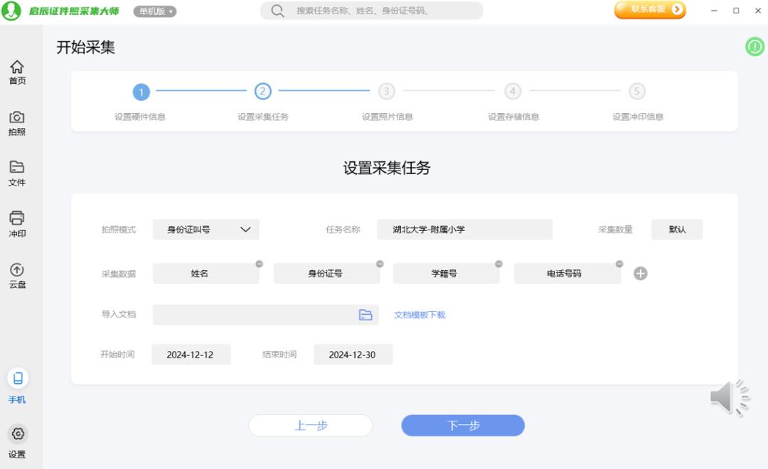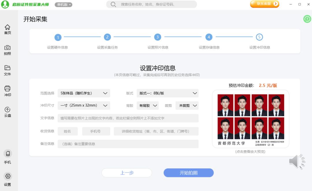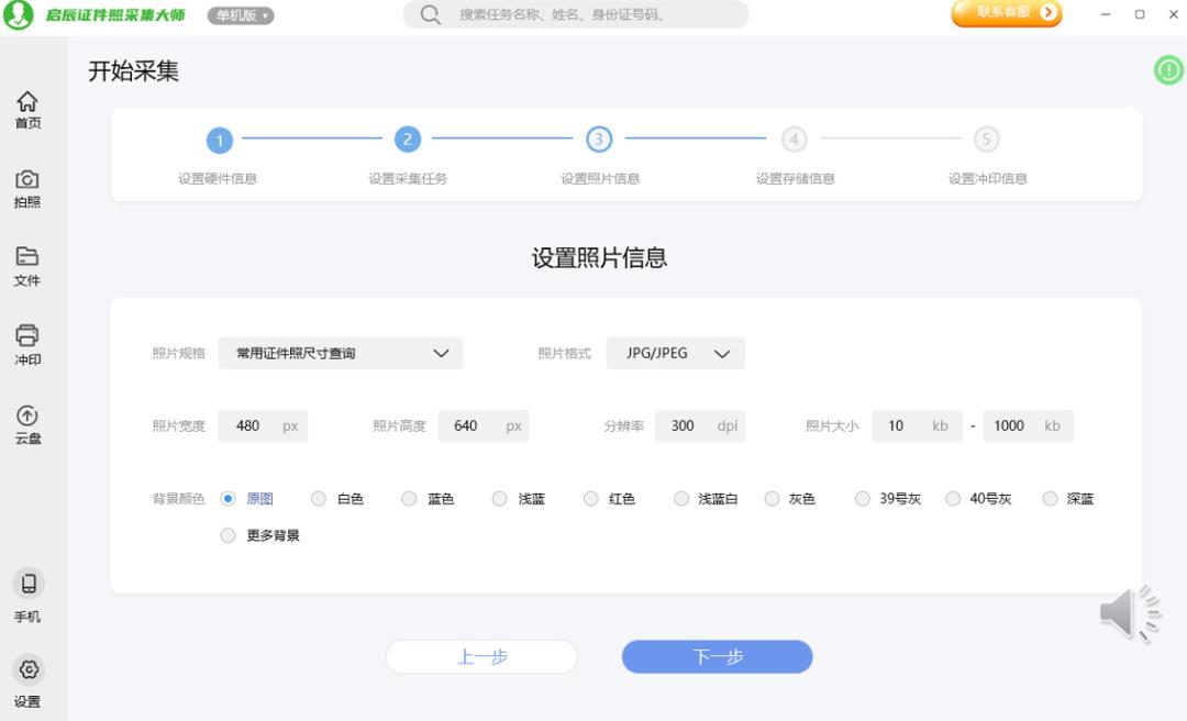 1)设置采集任务,包括照片尺寸、背景要求,文件命名方式,叫号模式等。