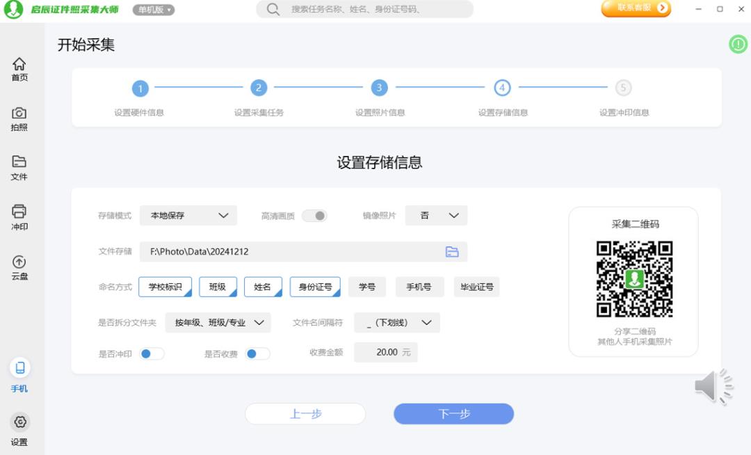 软件支持叫号拍照、扫码拍照、身份证读取拍照、身份证叫号拍照四种采集模式,用户可根据实际场景灵活选择。所有模式均支持付款与冲印功能联动,实现采集-支付-冲印一体化闭环操作。