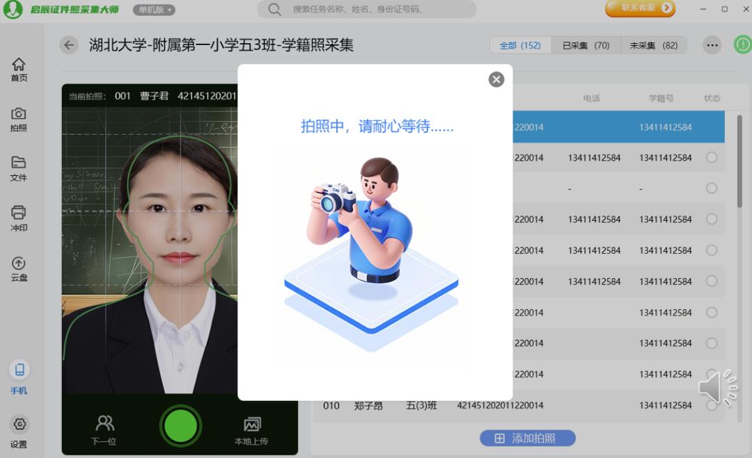 该模式专为需现场排队的大规模采集场景设计(如学校学籍照和毕业照采集、医院体检、政务大厅等),结合身份证核验与智能叫号系统,确保采集秩序与效率: