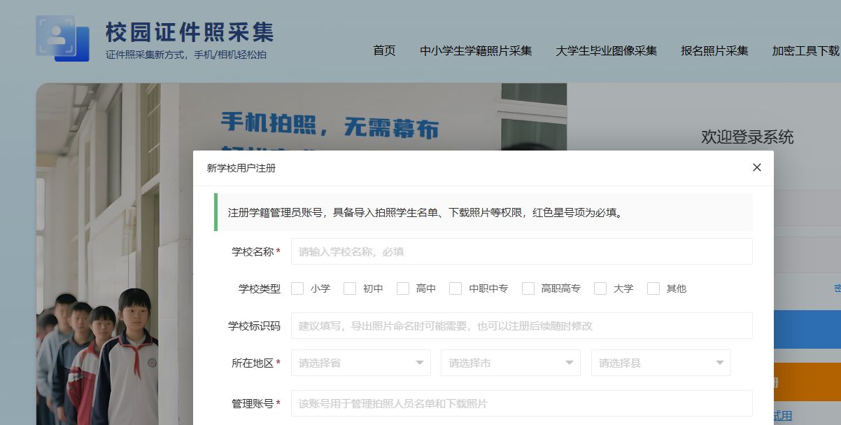 针对学校集中采集和考生自行拍摄两种场景,校园证件照采集平台(school.dianzizhao.com)提供了针对性工具,无需专业摄影设备,普通教室或办公室即可完成批量制作。
