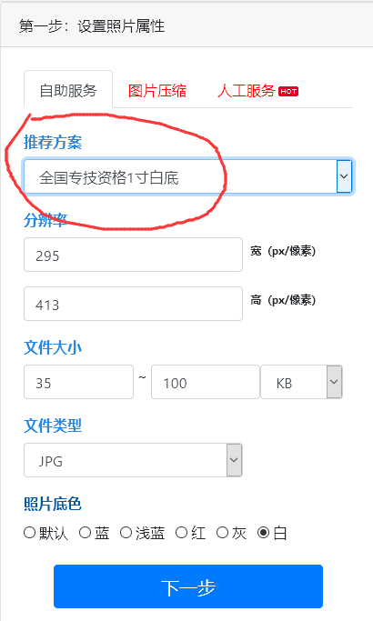 (六)在“推荐配置”中选择【全国专技资格1寸白底】