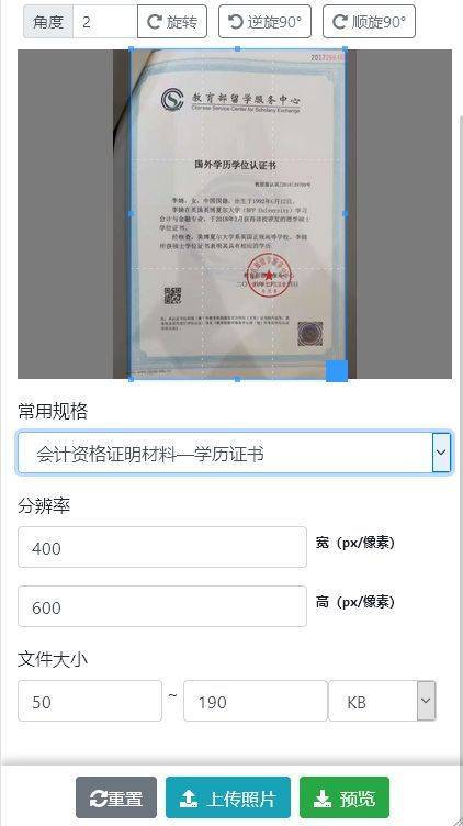 上传后进行裁剪,在常用规格中选择【学历证书】,就可以完成图片压缩了。