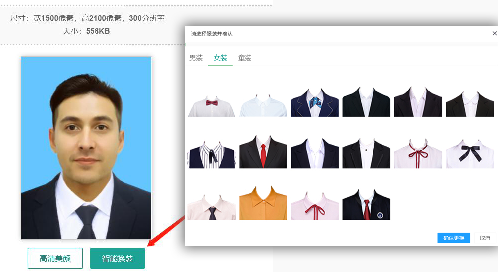 想换正装也很简单,只需要点击【智能换装】按钮就可以选择想到的服装,男士、女士和儿童服装都有的: